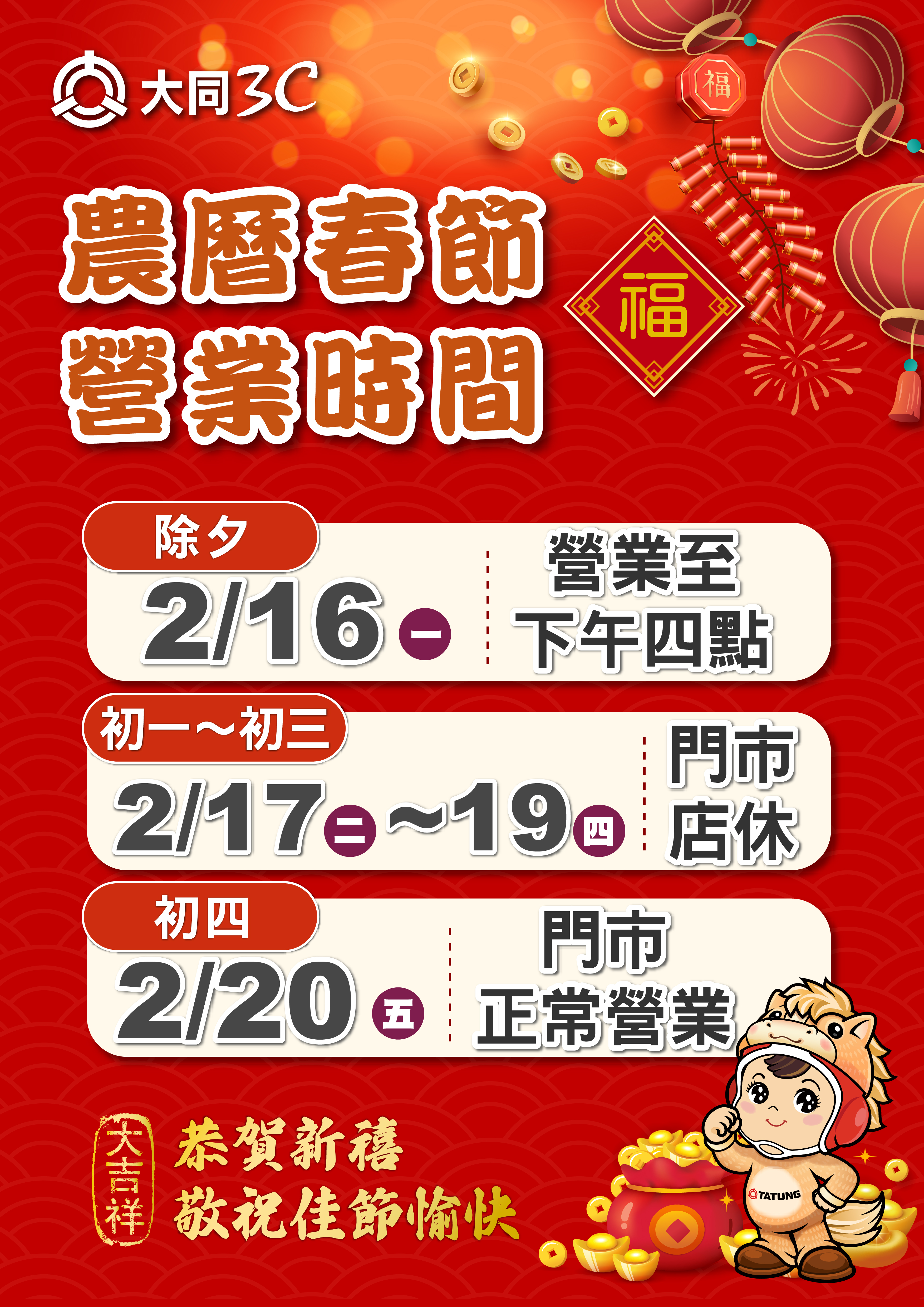 2026年 農曆春節門市營業時間公告